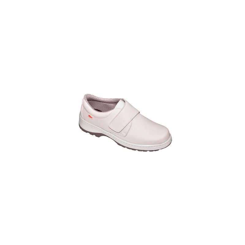 Zapato con cierre de velcro, lavable en frío y caliente hasta 40º, pala de microfibra forrada interiormente, altamente TRANSPIRABLE con gran capacidad de absorción de humedad y rápido secado. Horma recta de puntera redondeada. Contrafuerte de dureza suficiente para sujetar el calcáneo. Plantilla acolchada de tejido sobre espuma de poliuretano con tratamiento antibacterias y carbón activado. Suela de poliuretano bicolor, antideslizante de gran coeficiente en seco y húmedo, con resaltes acanalados en la suela para facilitar la evacuación de líquidos. Fabricado mediante montado y cosido de seguridad para reforzar la unión de la suela al corte del zapato.