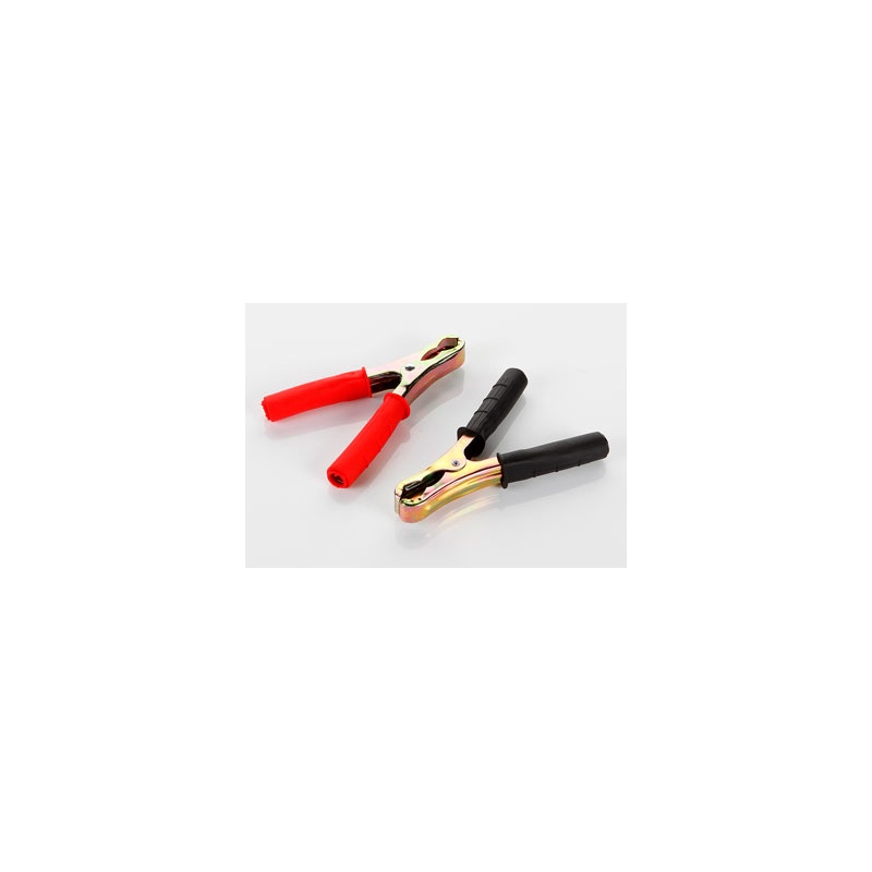 Juego de dos pinzas para baterías, una roja y otra negra. Cuentan con capacidad para soportar hasta 250 amperios y están indicadas para cables de 25-35 mm2, con un diámetro máximo de 11 mm.