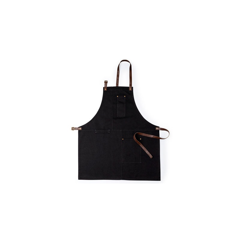 Delantal pro de alta calidad en resistente material 100% algodón canvas de 340g/m2., con cintas de cuello y cintura en resistente polipiel con ajuste mediante hebilla y reforzado con remaches metálicos.