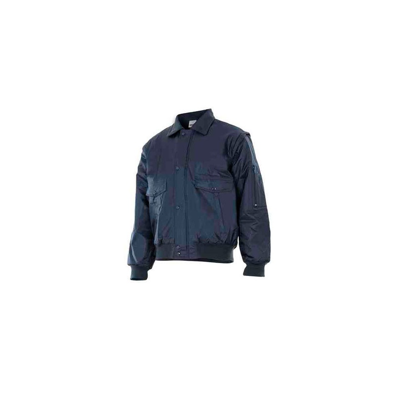 Cazadora acolchada impermeable con cierre central de cremallera oculta con tapeta. Botones automáticos, puños, cuello interno y laterales de la cinturilla de canalé, varios bolsillos externos y dos internos, capucha en el interior del cuello y mangas desmontables.