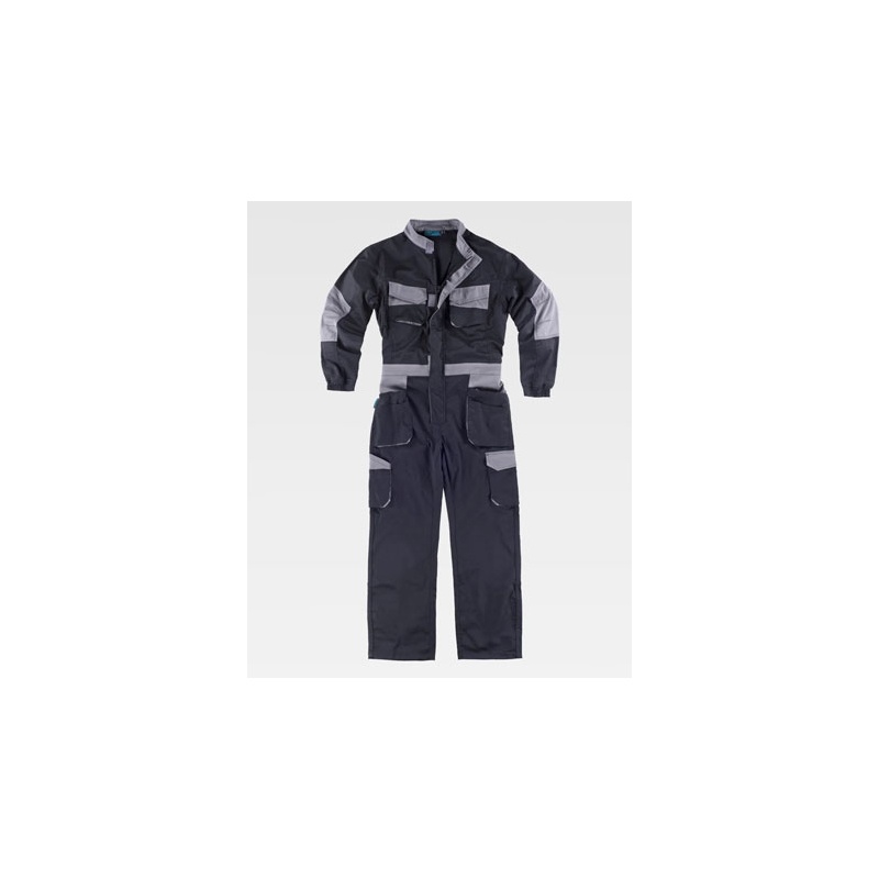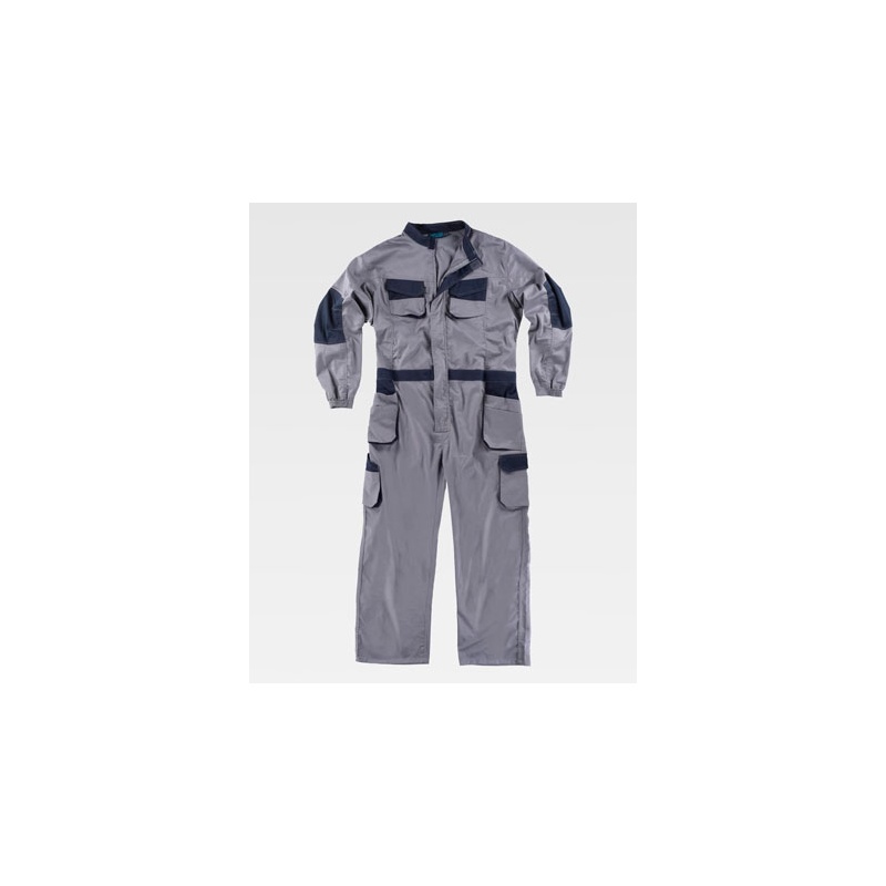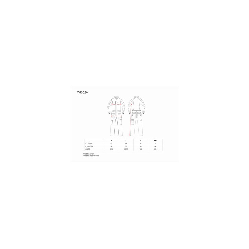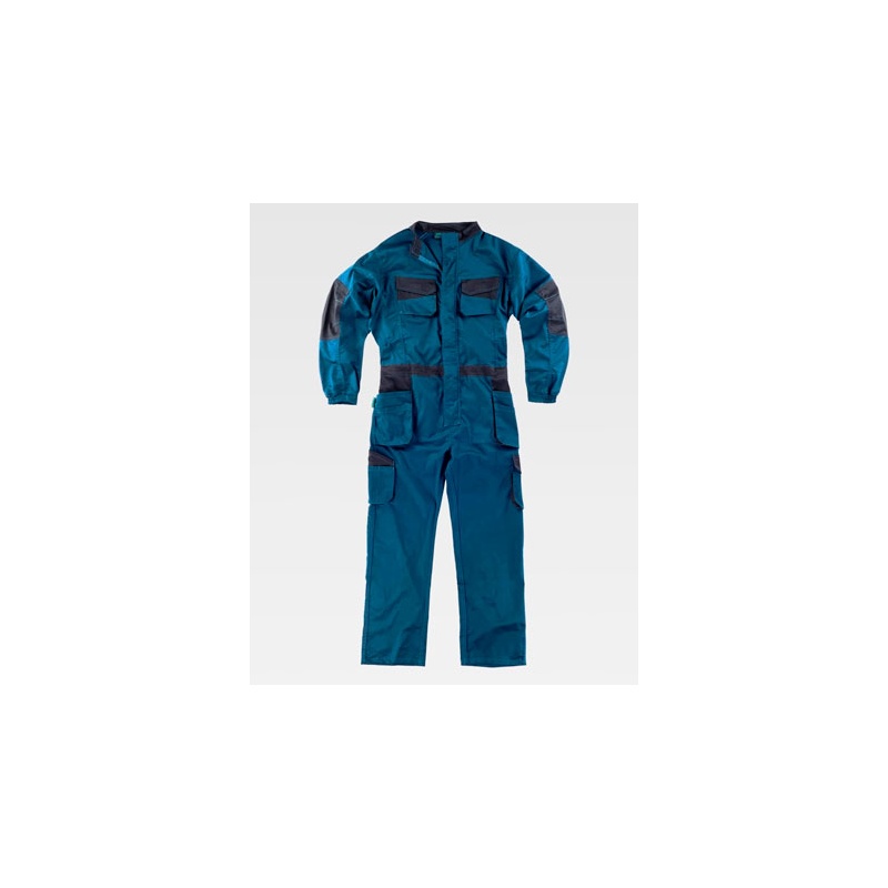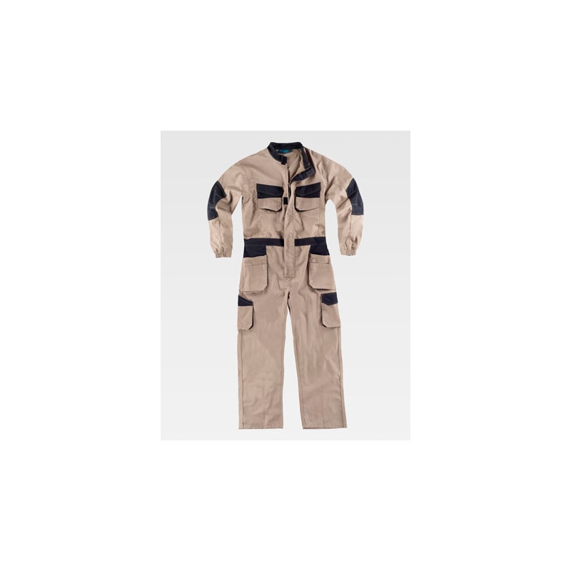 Buzo combinado con tejido elástico. Cuello de tira y cierre de cremallera de nylon de doble tirador oculta por solapa postiza con velcro. Dos bolsos de pecho de carga con tapeta de velcro. Dos bolsos de carga en los costados con bolsos superpuestos. Un bolso lateral de carga con cartera de velcro y otro de espátula doble. Dos bolsos traseros de plastón y cartera de velcro. Puño con elástico. Elástico en la espalda.